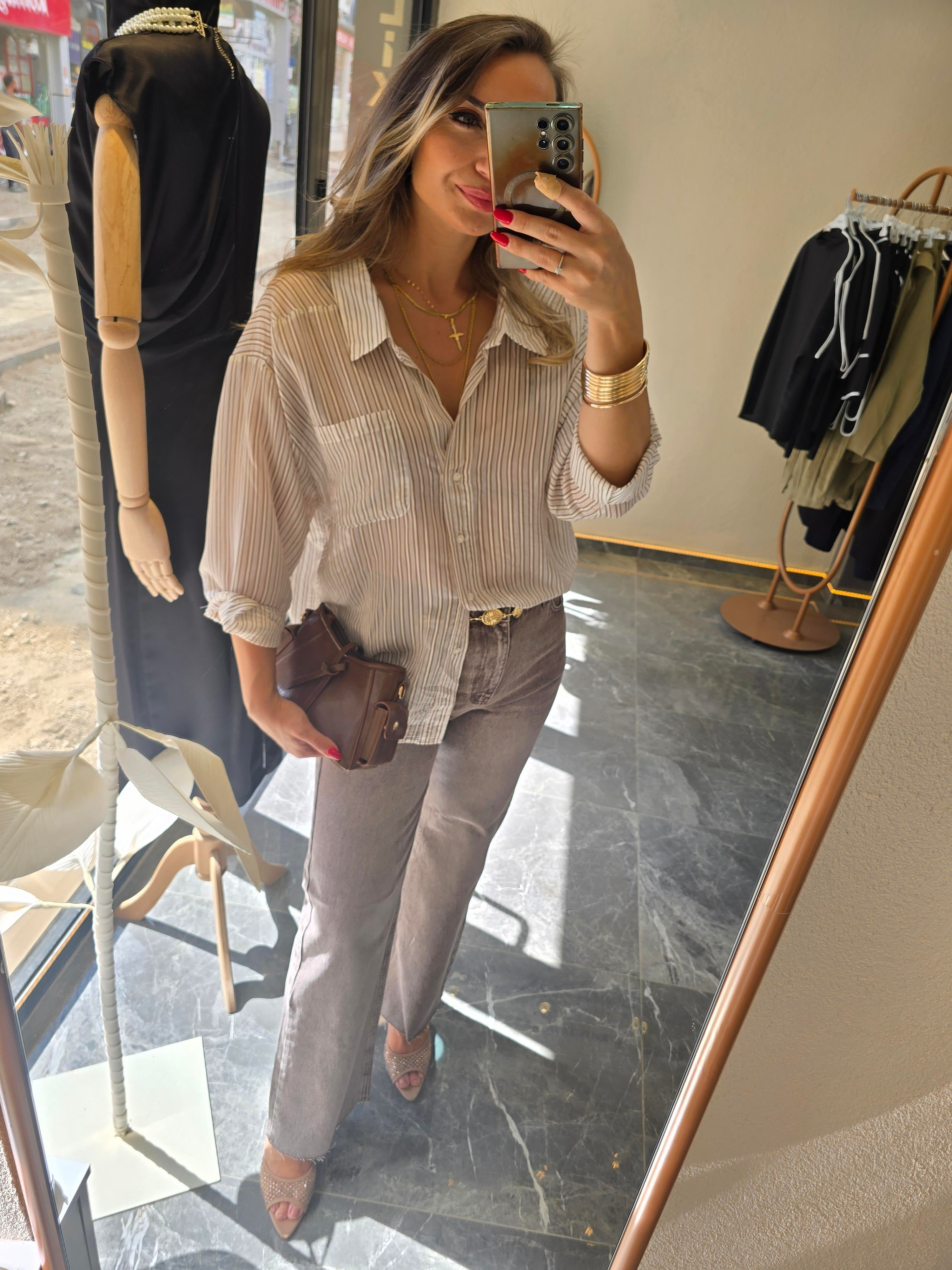 KAHVE ÇİZGİLİ OVERSİZE GÖMLEK