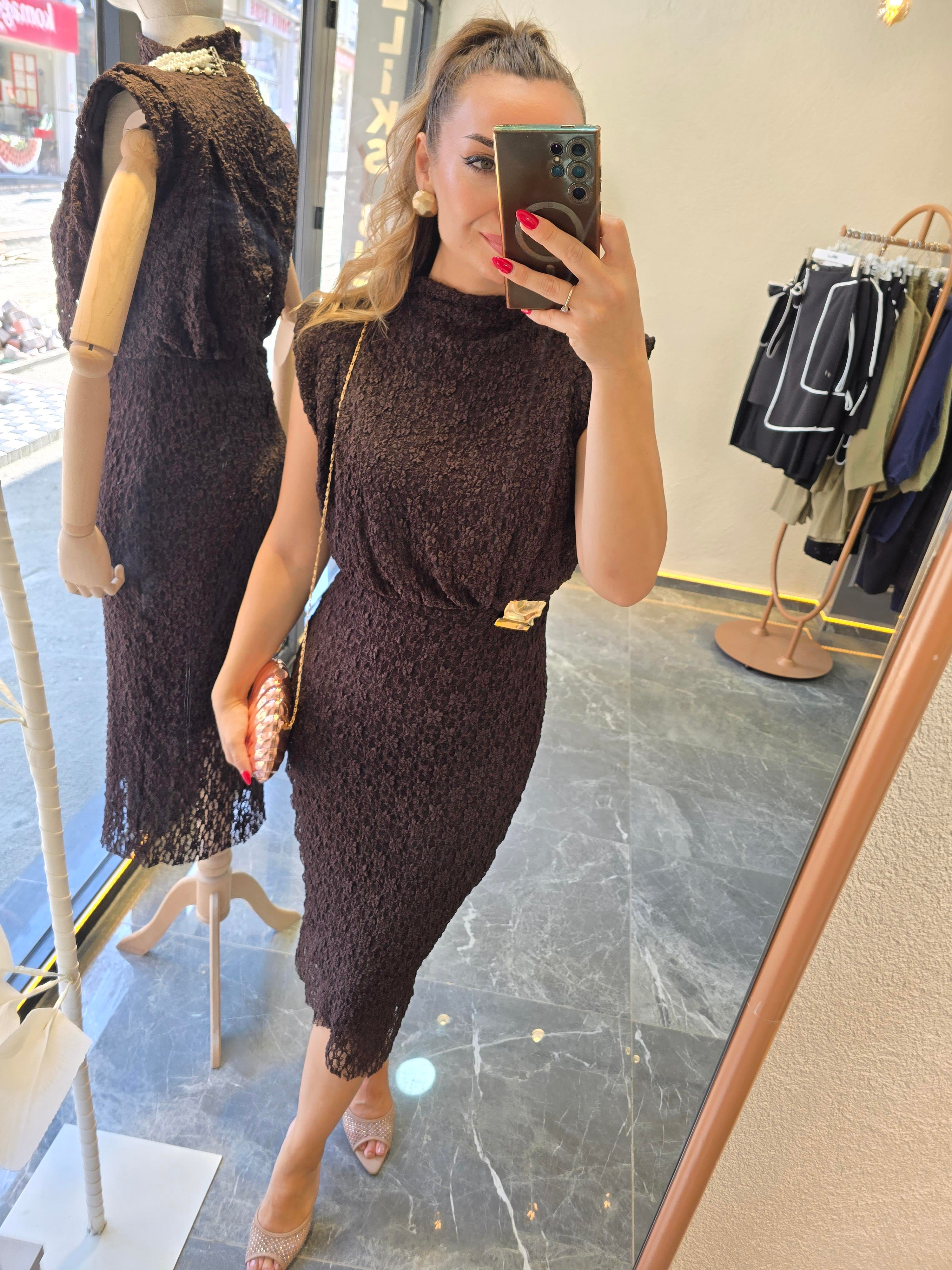KAHVERENGİ LİKRALI DANTEL ELBİSE