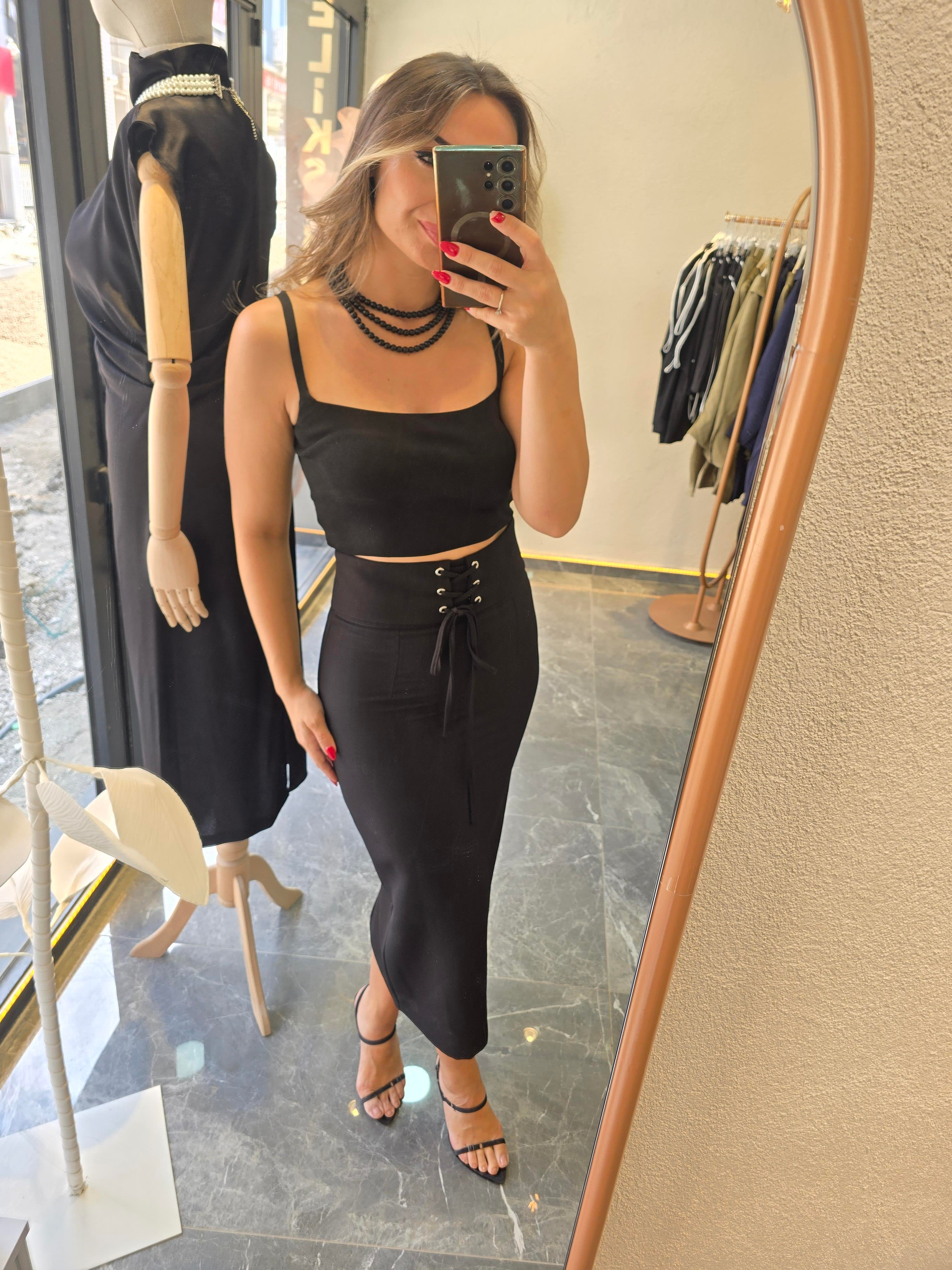 YÜKSEL BEL LİKRALI SİYAH KALEM ETEK